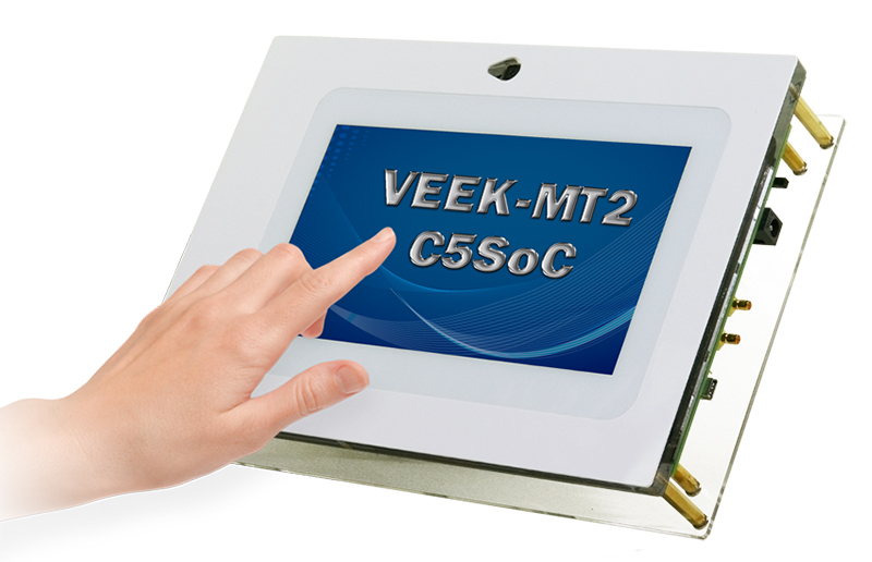 The all-in-one embedded solution offered on the VEEK-MT2-C5SoC, in combination with the LCD touch panel and digital image module, provides embedded developers the ideal platform for multimedia applications with unparallel processing performance. Developers can benefit from the use of this FPGA-based embedded processing system utilizing mitigating design risk and obsolescence, design reuse, reducing bill of material (BOM) costs by integrating powerful graphics engines within the FPGA, and by lower costs.