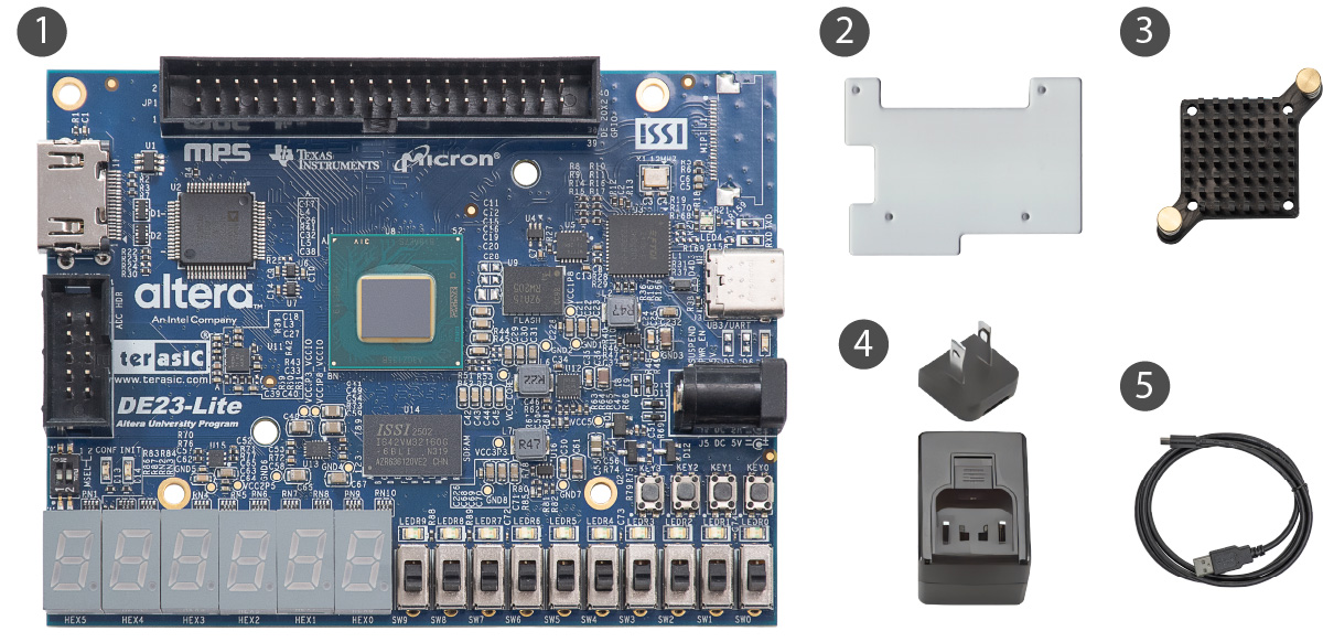 DE23-Lite Development Kit Page 5. Kit Contents 1. Overview 2. Specifications 3. Layout 4. Resources 5. Kit Contents 6. Order Now DE23-Lite Board Acrylic (Installed) Heatsink (Installed) DC 5V/2A Power Supply Type-C USB Cable The accessories might not look exactly the same as shown on this webpage Resources Order Now